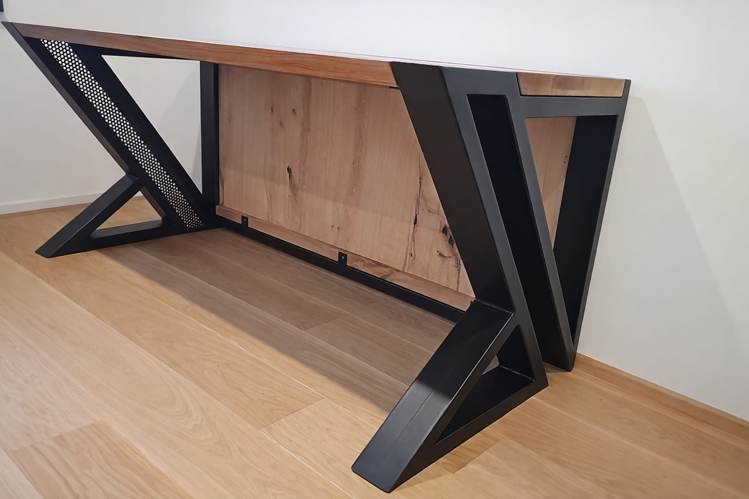 Povrchová úprava železného rámu je prášková barva. Dřevěné desky jsou z masivního dubu.
